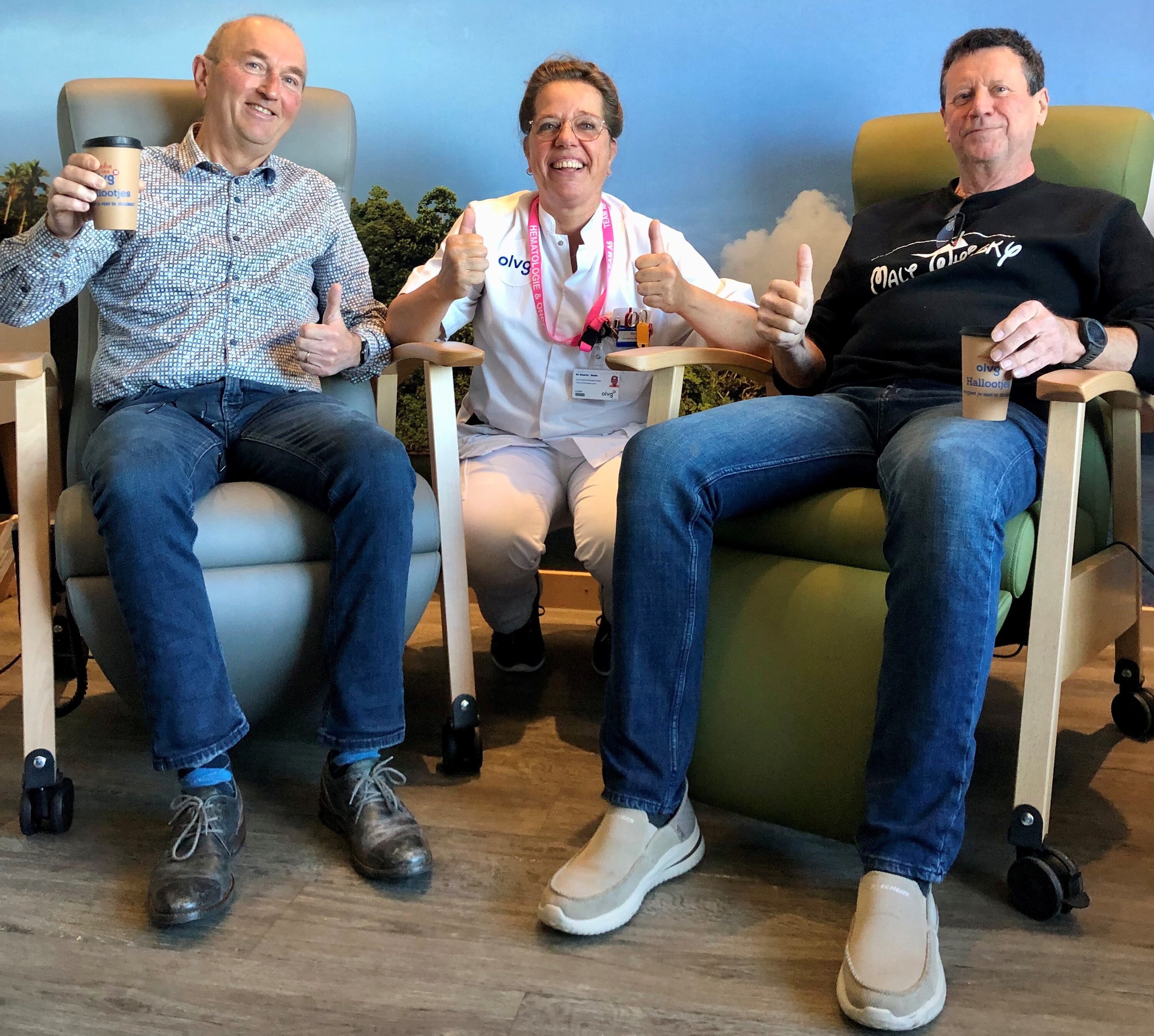 De afdeling Hematologie/Oncologie van OLVG, locatie West is altijd druk. Verpleegkundigen hoorden regelmatig van patiënten dat de stoelen in de patiëntenkamers zeer oncomfortabel zijn. Zeker als je er weken achter elkaar verblijft tijdens een chemotherapie. Dat was ook de mening van patiënten Ad en Hans (in de nieuwe relaxstoelen op de foto). Dankzij hen zette de afdeling vier multifunctionele, verrijdbare relax- en slaapstoelen op hun wensenlijst. En voor dit soort wensen gaan de Vrienden van OLVG aan de slag.